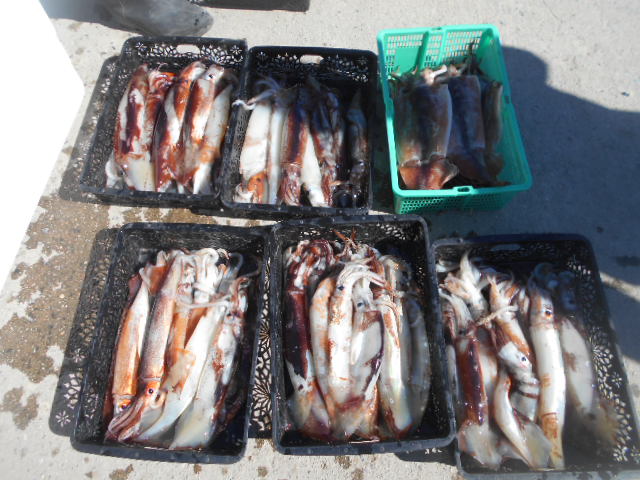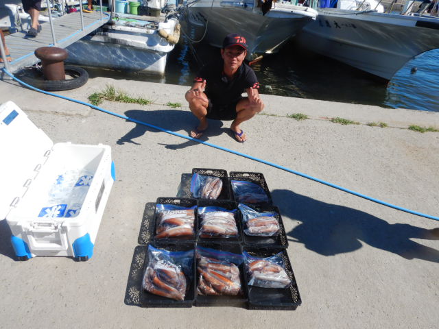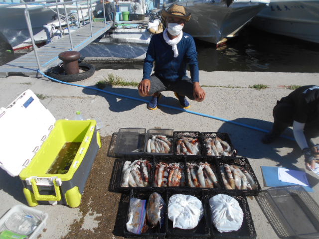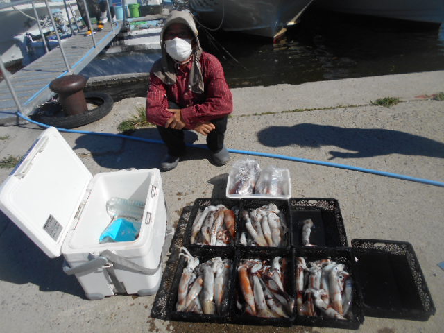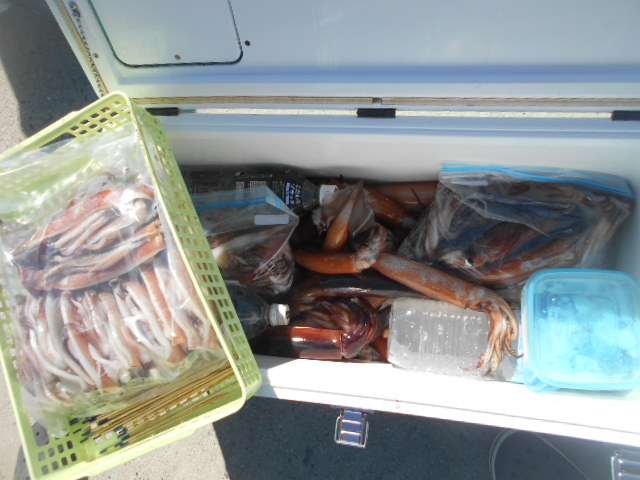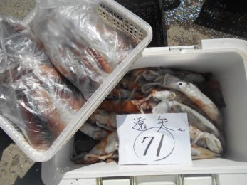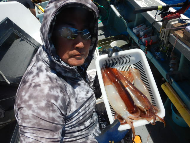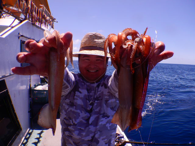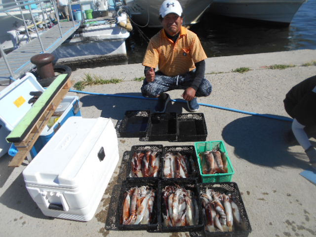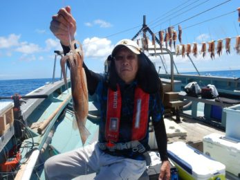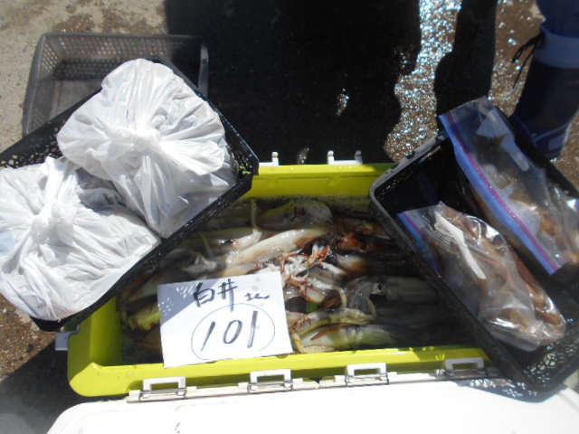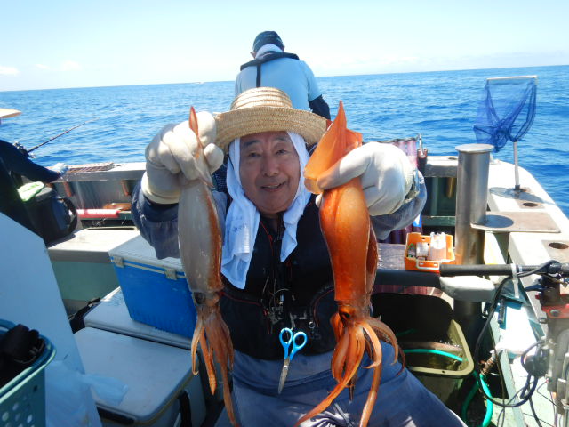本日もスルメイカ釣りコース大型船2隻で分乗しての出船です!! 竿頭様101匹を頭に大漁でしたね~ 中盤から群れも固まりノリノリ~♪♪釣り放題!! 天気も良く沖干しもたくさん作れました!! 絶好調につき明日も出船!!っと言いたいところですが明日は残念ながら定休日となりお休みです。 次回の出船は明後日8/6日(金)出船致します!! まだまだ空き多数ありますので宜しくお願いします!!